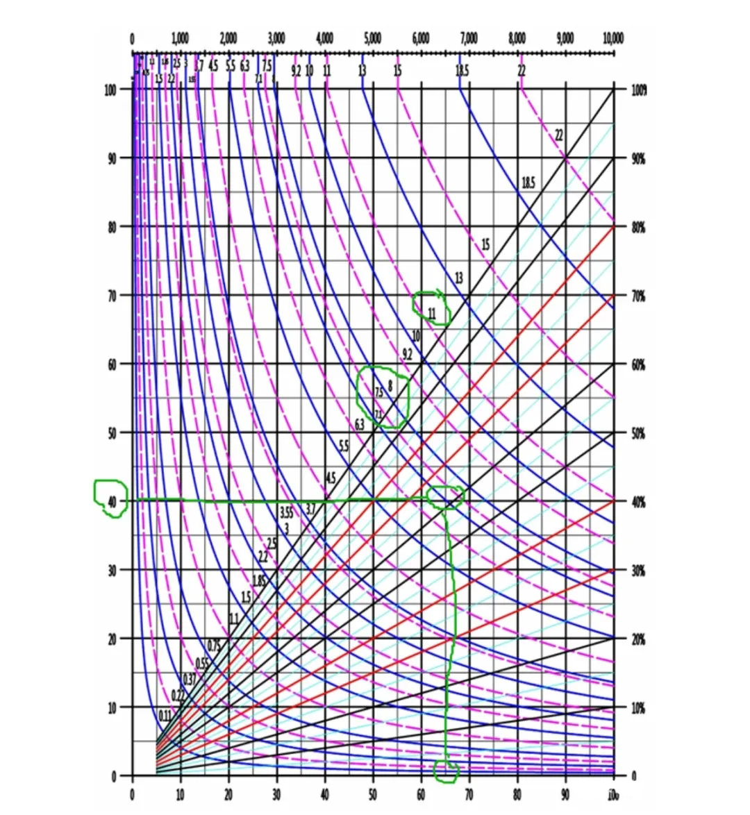 3.找到(6540)的交點(diǎn),發(fā)現(xiàn)這個(gè)交點(diǎn)在“75這條線的下方這表明這個(gè)工況點(diǎn)的軸功率略小于7.5kW;