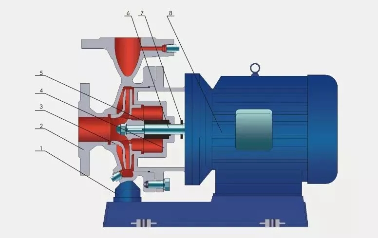 在泵啟動(dòng)前,泵殼內(nèi)灌滿被輸送的液體;啟動(dòng)后,葉輪由軸帶動(dòng)高速轉(zhuǎn)動(dòng),葉片間的液體也必須隨著轉(zhuǎn)動(dòng)。在離心力的作用下,液體從葉輪中心被拋向外緣并獲得能量,以高速離開(kāi)葉輪外緣進(jìn)入蝸形泵殼。