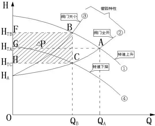 性則不變化。仍以用戶所需流量從QA減小為QB為例,當轉(zhuǎn)速下降時,揚程特性下降為曲線④,管路特性仍為曲線②,故工作點移至C點。可見:在流量減小為QB的同時,揚程減小為HTC;供水功率PG與面
