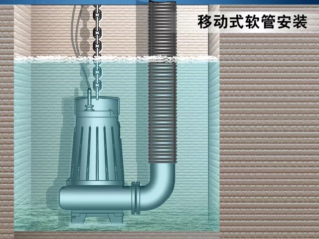 1)移動(dòng)式軟管安裝、移動(dòng)式硬管安裝適用于口徑不大于150mm,功率不大于22kw的潛水排污泵
