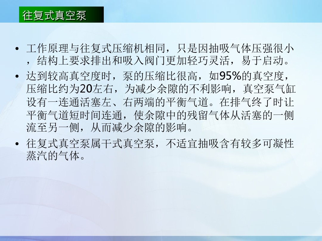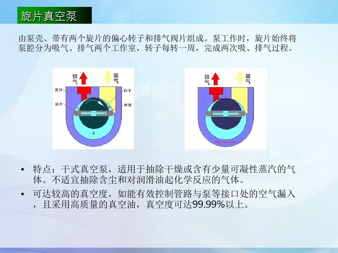 臥式泵的進氣口在上,排氣口在下。有時為了真空系統(tǒng)管道安裝連接方便,可將排氣口從水平方向接出,即進、排氣方向是相互垂直的。此時,排氣口可以從左或右兩個方向開口,除接排氣管道一端外,另一端堵死或接旁通閥。這種泵結構重心低,高速運轉時穩(wěn)定性好。一般大、中型泵多采用此種結構。