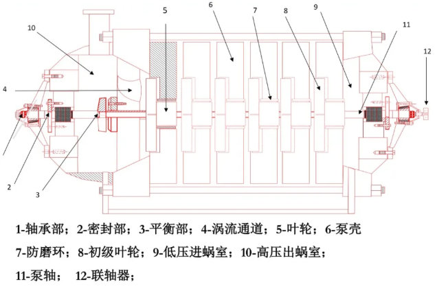 3.主要部件由:低壓吸入段(進(jìn)料管、進(jìn)料室);泵體(蝸殼、導(dǎo)翼、防磨環(huán));高壓輸岀端(泵頭);平衡裝置(平