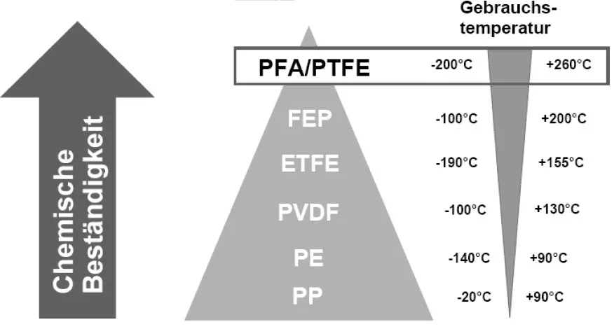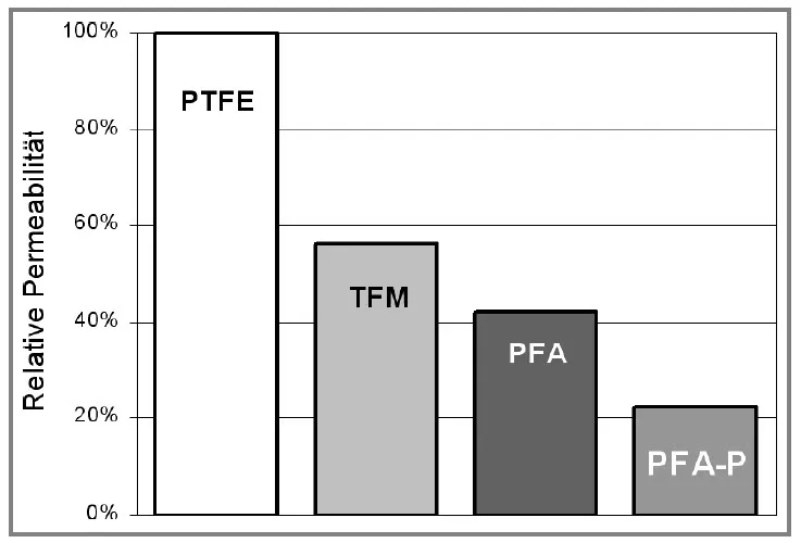 對(duì)于化合物PFA-P(“P”代表“滲透”),一種通過(guò)熱塑處理的PFA變體具有更高的滲透電阻,但具有相同的耐化學(xué)性和熱阻。在實(shí)驗(yàn)室和現(xiàn)場(chǎng)進(jìn)行的長(zhǎng)期試驗(yàn)表明:在所有工作范圍內(nèi),化合物PFA-P的滲透率至少降低了一半。