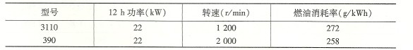 按污水泵每天工作情況,柴油機(jī)采用12 h功率配套,查柴油機(jī)樣本,可配套的機(jī)型及其性能如下表所示