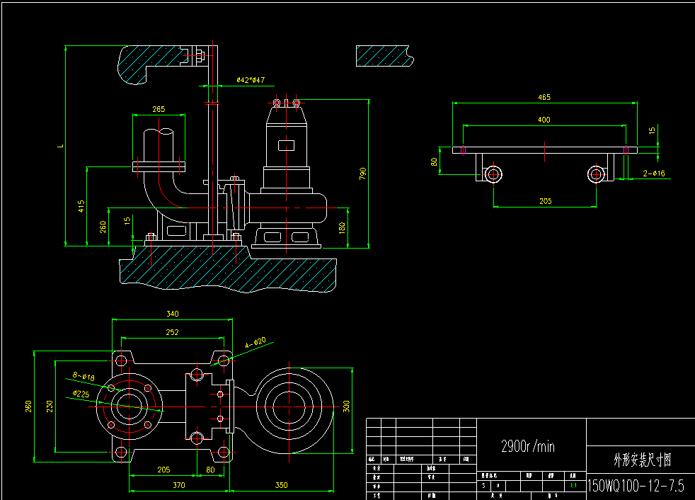 潛水泵耦合式安裝時,平面的開孔需考慮潛水泵的最小安裝尺寸。案例中A向視圖表示了水泵的最小安裝孔的大小尺寸,1000×700mm。
