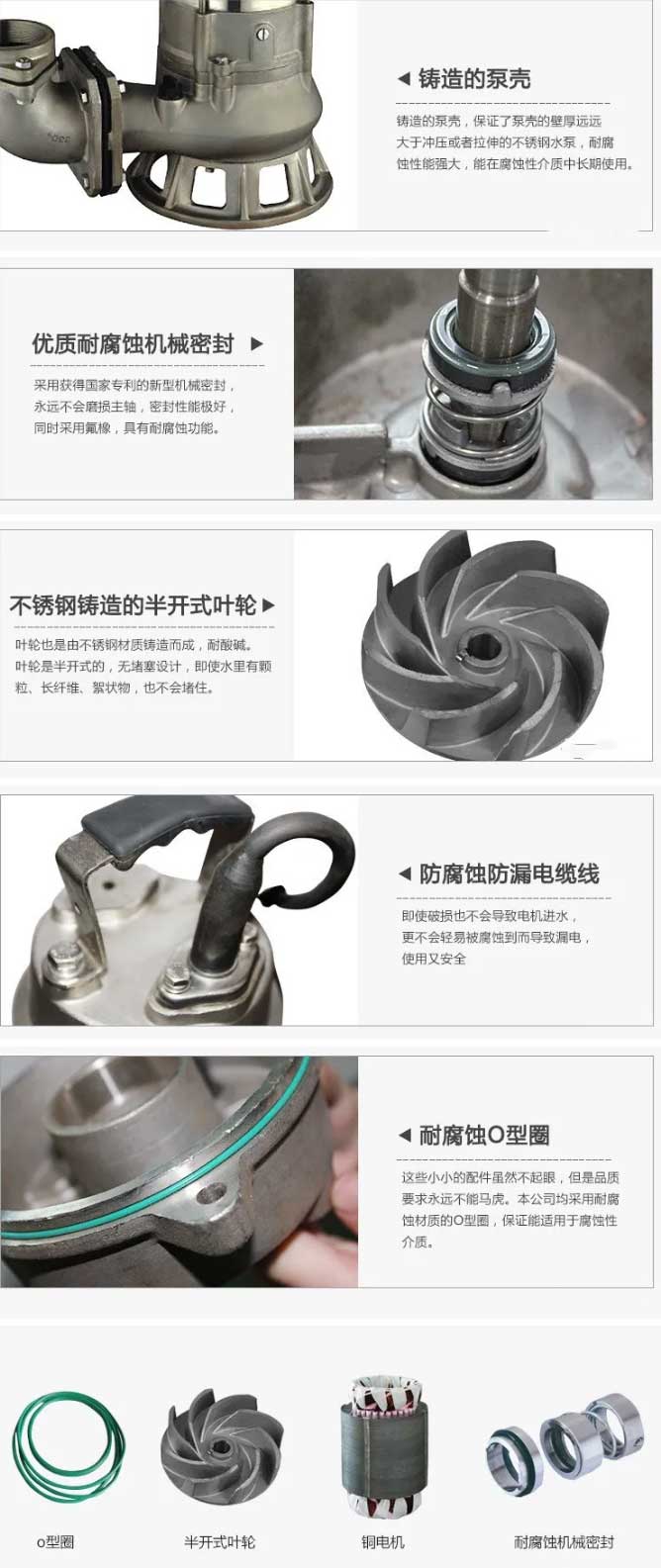 1、整體外殼采用不銹鋼SUS304 SUS316材質(zhì)精密鑄造制成,專門抽取有微酸弱堿的污水。