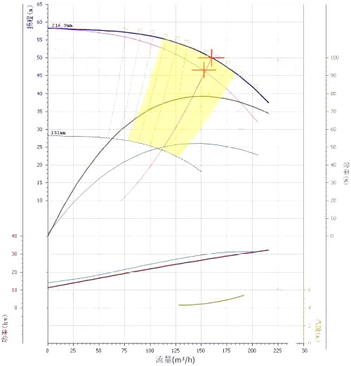 圖中有兩個(gè)十字線,上面的十字線是清水時(shí)的性能曲線,下面的十字線是修正后的性能曲線。從圖中可以看出,黏度修正后,效率下降,功率上升了!
