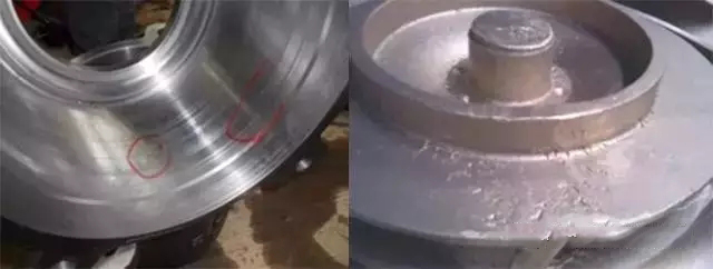 1.故障表現:圖示是由灰鑄鐵材料鑄造的流程泵葉輪在5年時間內被含有少量水泥泡沫的水磨損的情況,磨蝕問題更多的是設計方選材不當或泵型選擇不當造成的,或者是工藝介質被污染導致的。