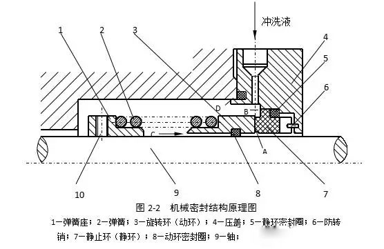 如圖2-3所示,單端面密封離心泵的軸封由一對摩擦副密封端面組成,只有一級密封,一般有自沖悉系統(tǒng),無外供液沖洗冷卻系統(tǒng),當這一級密封泄漏時,泵體介質(zhì)會直接泄漏到環(huán)境中,主要適用于一般介質(zhì)場合。與其他輔助密封并用時,可用于帶懸浮顆粒、高溫、高壓等場合。