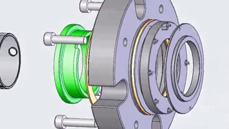 機械密封(也稱端面密封)是一種用來解決旋轉(zhuǎn)軸和機體之間的密封裝置,它是由至少一對垂直于旋轉(zhuǎn)軸線的端面,在流體壓力和補償機構彈力的作用及輔助密封的配合下,保持貼合并相對滑動而構成防止流體泄漏的裝置,常用于機泵、壓縮機等旋轉(zhuǎn)式流體機械。機械密封的基本元件由動環(huán)、靜環(huán)、壓蓋、推環(huán)、彈簧、定位環(huán)、軸套、輔助密封(動靜環(huán)密封圈、軸套密封圈)組成。其機械密封外形結構圖如圖2-1