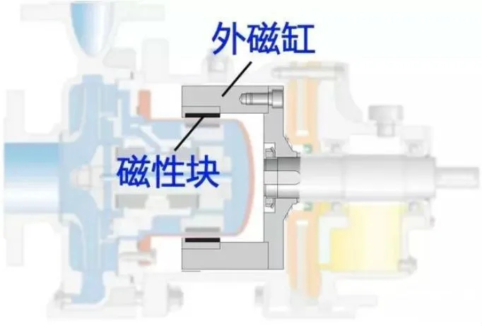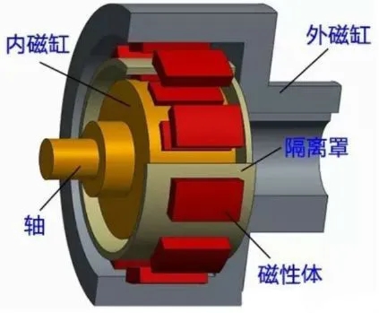 外磁缸與電機(jī)相連,同樣在外磁缸的圓柱面上裝有磁塊,磁塊間由隔磁材料隔離、支撐。外磁缸一般不再增加保護(hù)套(不會與介質(zhì)接觸)。