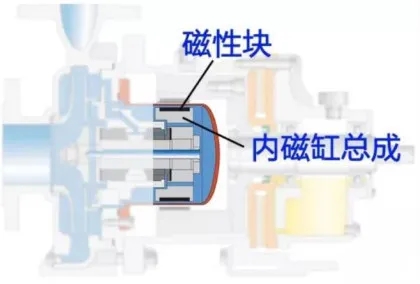 內(nèi)磁缸和泵轉(zhuǎn)子同軸,在與軸向平行的方向裝有永磁塊,磁塊間由不銹鋼等材料進(jìn)行隔離,以便隔磁(減小橫向漏磁)、支撐保護(hù),為保護(hù)內(nèi)磁缸上的磁塊,一般會在內(nèi)磁缸外表覆蓋一層保護(hù)材料(如塑料、不銹鋼等)。
