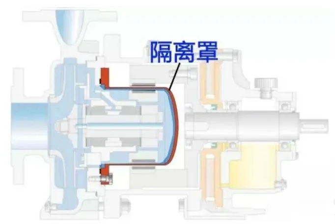 隔離罩位于內(nèi)、外磁缸之間,與泵體采用一定措施進(jìn)行固定,以便形成封閉腔體。隔離罩的主要材料有不銹鋼、鈦合金、塑料、碳素纖維、陶瓷等材質(zhì)。