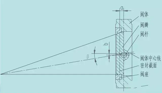 閥板回轉(zhuǎn)中心(即閥門(mén)軸中心)于閥板密封截面形成一個(gè)A偏置,并與閥體中心形成一個(gè)b偏置;閥體密封面中心線與閥座中心線(即閥體中心線)形成一個(gè)角度為β的角偏置。