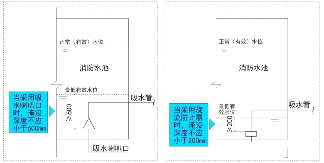 三、消防水泵吸水口的淹沒深度應(yīng)滿足消防水泵在最低水位運(yùn)行安全的要求。吸水管喇叭口在消防水池最低有效水位下