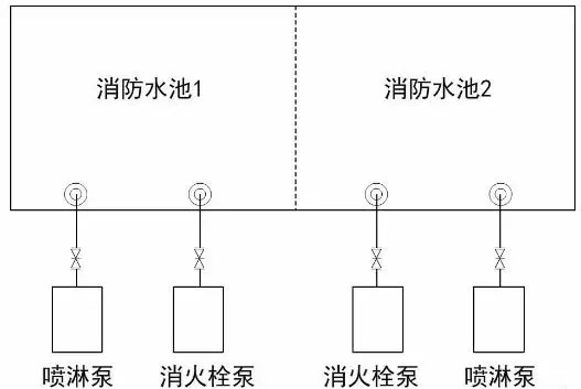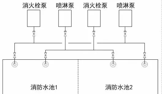 方案四(不應(yīng)):本方案存在較大隱患,當(dāng)一格(或一座)消防水池檢修時(shí),泵組不再具備一用一備的功能。