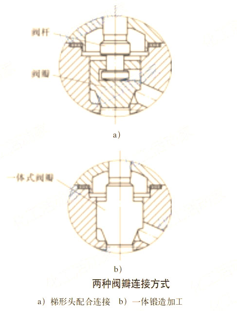 對于小口徑鍛鋼截止閥(≤DN50),閥桿和閥瓣的連接方式由梯形頭配合連接,改為采用一體鍛造加工成形,此種方式消除了閥瓣與閥桿之間的活動間隙,從而減小閥瓣傾斜度,達(dá)到密封可靠的目的。