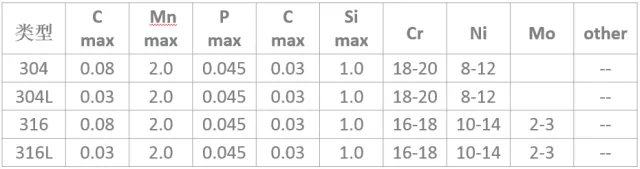 不銹鋼:耐空氣、蒸汽、水等弱腐蝕介質(zhì)或具有不銹性的鋼種。通常使用的鋼種為304、304L、316、 316L,是奧氏體不銹鋼的300系列鋼。