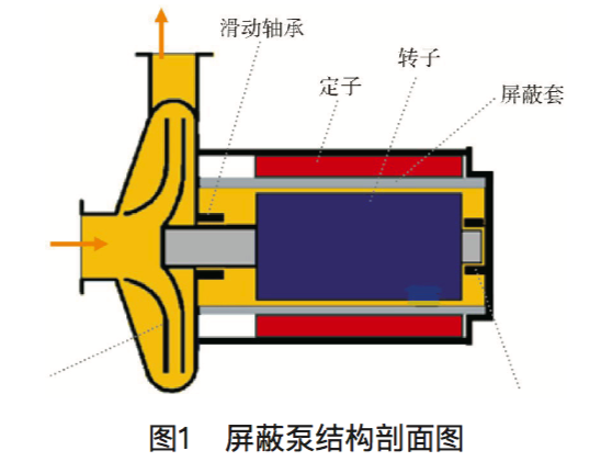 屏蔽泵因其自身結(jié)構(gòu)原因,自身帶有二次保護功能,在轉(zhuǎn)子屏蔽套破裂后,定子筒體能防止有毒有害介質(zhì)的外漏,而此時的定子筒體相當于第二層隔離套,從而起到第二層保護的作用,如圖1所示。