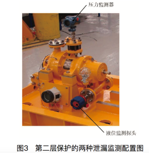 泄漏監(jiān)測儀表一般有兩種配置,如圖3所示:一種是對泄漏后易氣化的工藝介質(zhì),一般采用壓力監(jiān)測器;而另一種對泄漏后為液態(tài)的工藝介質(zhì),一般采用液位監(jiān)測探頭。通過這些泄漏監(jiān)測儀表的監(jiān)測,現(xiàn)場人員便可以馬上采取相應(yīng)的應(yīng)急措施,及時對問題設(shè)備進行檢查維護,以防止有毒有害介質(zhì)泄漏所造成的二次傷害。