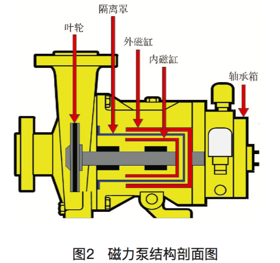 而磁力泵則不同,磁力泵傳動主要由磁力耦合器來完成。磁力耦合器由內(nèi)外磁缸及隔離套等部件組成(如圖2所示),是磁力泵的核心部件。除了磁力泵的磁力耦合器部分,其余結(jié)構(gòu)基本與普通帶密封離心泵相似。