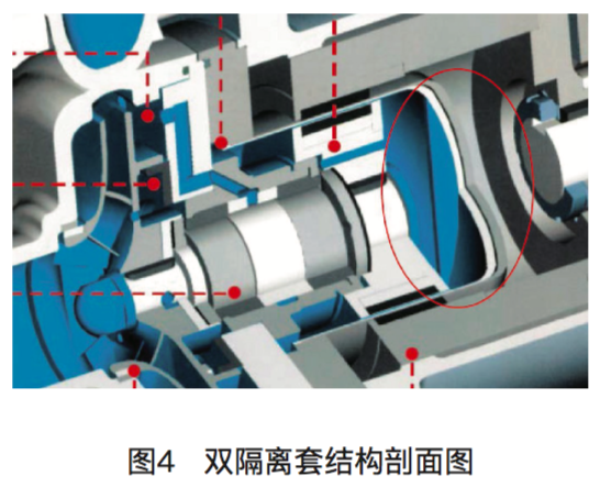 第一種,雙隔離套結(jié)構(gòu)。顧名思義就是比普通磁力泵多一個隔離套,由內(nèi)層和外層組成,之間形成一個環(huán)形的空腔(如圖4所示),并配有破裂檢測儀表。當內(nèi)隔離套破裂或其他原因有液體進入空腔時,監(jiān)測儀表就會報警,這樣就能安全有效的起到二次保護作用,且能做到第二層保護零泄漏,應(yīng)用廠商有KlausUnion等。由此可見,雙隔離套結(jié)構(gòu)適合在介質(zhì)泄漏時,要求第二層保護做到零污染、零泄漏的裝置內(nèi)應(yīng)用。