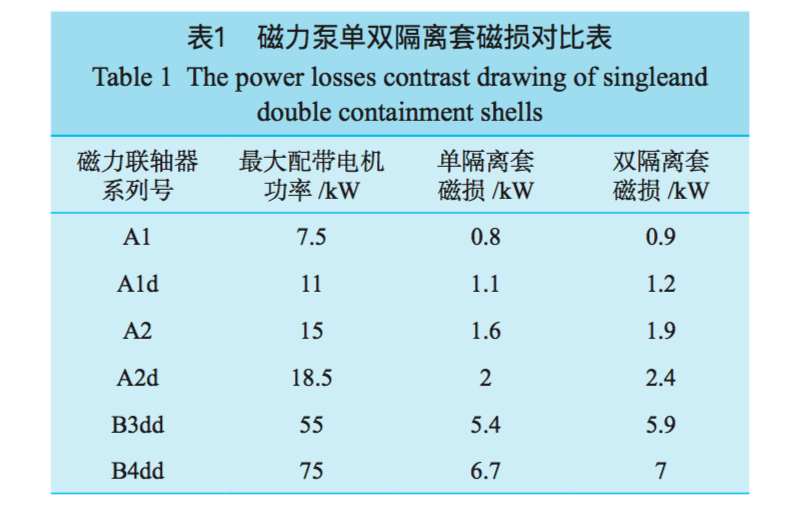 由于磁力線通過外磁缸傳遞給內(nèi)磁缸并帶動內(nèi)磁缸轉(zhuǎn)動,這樣,雙隔離套設(shè)計就需要切割兩層隔離罩,隔離套的厚度加大,則增加了內(nèi)外磁缸的間隙尺寸,這樣降低了磁傳動轉(zhuǎn)矩,增大了隔離套內(nèi)的渦流損失,從而導(dǎo)致整個磁力損失上升,機械效率相較單隔離套設(shè)計就降低更多,整個泵的用電負荷會隨之增加,直至影響長遠的運營成本。表1為某磁力泵廠商在部分電機功率下,單、雙隔離套的磁損對比表。