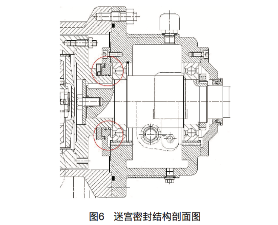 最終究其原因為,此兩位號泵均為重載荷泵,即所謂的大泵,軸徑較大,而國內(nèi)制造業(yè)對二次密封迷宮槽間隙加工的精度不夠,磁力泵制造商對二次密封運用的經(jīng)驗也不是很足,設(shè)計的迷宮密封的徑向間隙較大,而導(dǎo)致上述情況的產(chǎn)生。此外,現(xiàn)場發(fā)現(xiàn)上述情況后,操作人員誤認為軸承箱潤滑油不足,在添加軸承箱潤滑油時,油位注入過高,繼而導(dǎo)致攪拌過度而溫度不降反升;同時由于潤滑油過多,繼而繼續(xù)向間隔腔泄漏的情況[4]。