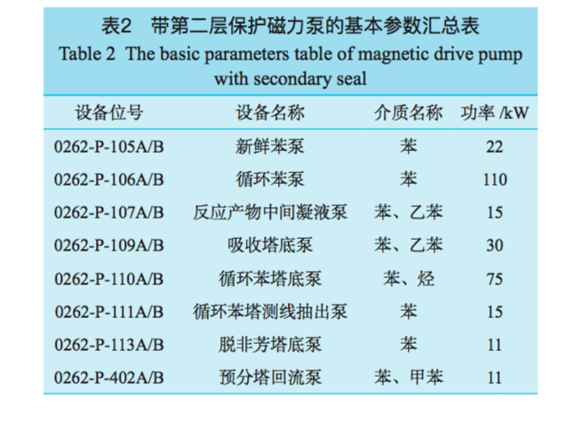 在國內(nèi)某8×104t/a乙苯/苯乙烯裝置中(采用中國石化兩級負壓絕熱乙苯脫氫制苯乙烯的技術(shù),即ST的工藝包),由于國家對環(huán)保要求的提高,對有毒有害介質(zhì)要求選用磁力泵,而對苯等劇毒介質(zhì),磁力泵需要增加第二層保護,并需要配有音叉式液位探頭進行液體泄漏監(jiān)測。而該項目最終經(jīng)過綜合考慮,所選磁力泵的第二層保護形式為節(jié)流襯套加迷宮密封形式,具體帶第二層保護磁力泵的基本參數(shù)見表2。