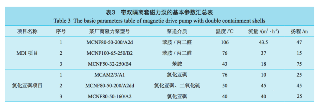 又如國內(nèi)某氯化亞砜項目中,同樣存在大量輸送劇毒介質(zhì)氯化亞砜的磁力泵,同樣一旦發(fā)生泄漏,現(xiàn)場人員如果吸入該介質(zhì)后,在短期內(nèi)有嚴重中毒表現(xiàn)、甚至會致死,所以對磁力泵的第二層保護要做到零泄漏。而國內(nèi)外類似情況的裝置還有不少,用戶一般又相當重視項目的HSE管理,而磁力泵的雙隔離套結(jié)構(gòu)完美的解決了這個問題。表3為兩項目中部分帶雙隔離套磁力泵的基本參數(shù)匯總。