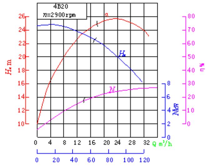 特性曲線是在固定的轉速下測出的,只適用于該轉速,故特性曲線圖上都注明轉速n的數(shù)值,圖2-6為國產(chǎn) 4B20型離心泵在n=2900r/min時特性曲線。圖上繪有三種曲線