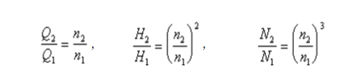 離心泵的特性曲線是在一定轉速下測定的。當轉速由n1改變?yōu)閚2時,其流量、壓頭及功率的近似關系為
