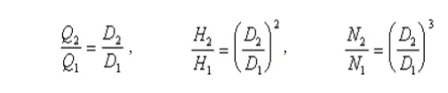 當葉輪直徑變化不大,轉速不變時,葉輪直徑、流量、壓頭及功率之間的近似關系為
