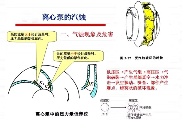 當(dāng)離心泵的吸入高度過大并且液體溫度比較高時,致使吸入口壓強(qiáng)小于或等于液體飽和蒸汽壓,則在該環(huán)境下液體就會在泵進(jìn)口處沸騰汽化,在泵殼內(nèi)形成一個充滿蒸汽的空間,隨著泵旋轉(zhuǎn),氣泡進(jìn)入高壓區(qū),由于壓差的作用,氣泡受壓破裂而重新凝結(jié),在凝結(jié)的一瞬間,質(zhì)點(diǎn)互相撞擊,產(chǎn)生了很高的局部壓力。