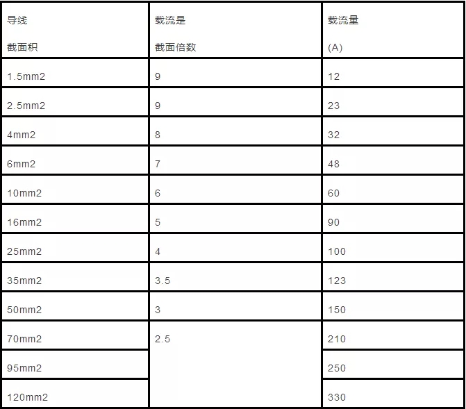 2.5mm’及以下的各種截面鋁芯絕緣線,其載流量約為截面數(shù)的9倍。如2.5mm’導(dǎo)線,載流量為2.5×9=22.5(A)。從4mm’及以上導(dǎo)線的載流量和截面數(shù)的倍數(shù)關(guān)系是順著線號往上排,倍數(shù)逐次減l,即4×8、6×7、10×6、16×5、25×4。