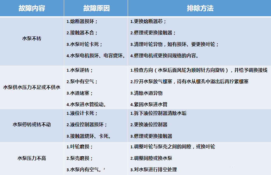如果第一、二步都做了,水泵還是不轉(zhuǎn),就依照下表排查水泵是否有故障。