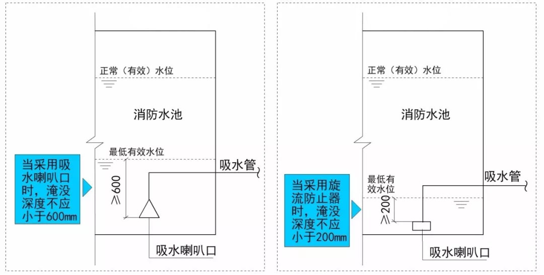 三、消防水泵吸水口的淹沒深度應(yīng)滿足消防水泵在最低水位運(yùn)行安全的要求。吸水管喇叭口在消防水池最低有效水位下的淹沒深度應(yīng)根據(jù)吸水喇叭口的水流速度和水力條件確定,但不應(yīng)小于600mm,當(dāng)采用旋流防止器時,淹沒深度不應(yīng)小于200mm;(5.1.13)