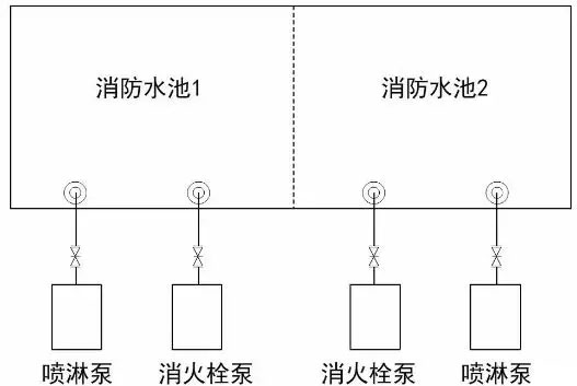 方案一:本方案為相對較好的方案,一個消防水池檢修,不影響消防水泵吸水。