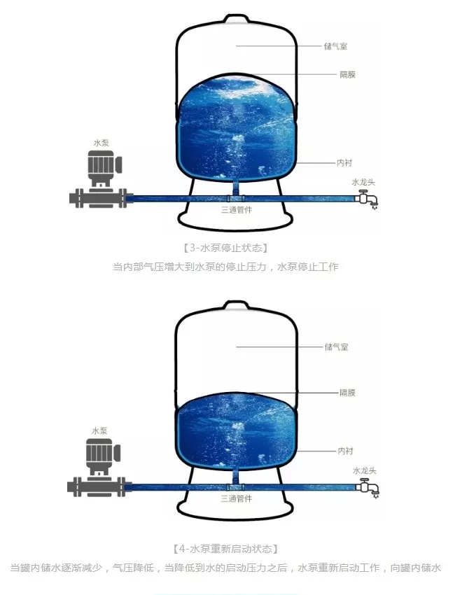 壓力罐內(nèi)部由橡膠制成的隔膜隔開分為兩個部分,一側(cè)連接到管道,叫做儲水室。另一邊有空氣,叫做儲氣室。