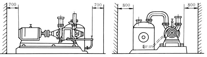 排污泵布置在室內(nèi)時(shí),一般不考慮機(jī)動(dòng)檢修車輛的通行要求。泵端或泵側(cè)與墻之間的凈距不宜小于1.2~1.5m,兩排泵之間凈距不應(yīng)小于2m。
