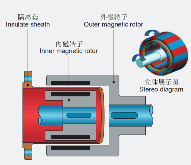 磁力泵(也稱為磁力驅(qū)動泵)上海浙甌泵閥制造有限公司生產(chǎn)的磁力泵主要由泵頭、磁力傳動器(磁缸)、電動機、底座等幾部分零件組成。利用永磁聯(lián)軸器的工作原理,無接觸傳遞力矩的新泵型。外磁鋼和電動機相聯(lián)為主動件,內(nèi)磁鋼和葉輪聯(lián)接為從動件,當(dāng)電機啟動后,通過磁力耦合驅(qū)動葉輪同步旋轉(zhuǎn),從而達到在密封的狀態(tài)下輸送液體之目的。泵的結(jié)構(gòu)以靜密封取代動密封,主、從動件之間裝有靜止隔離套,被輸送介質(zhì)封閉在隔離套內(nèi),因此徹底解決了機械密封一直解決不了的跑、冒、滴、漏之弊病。