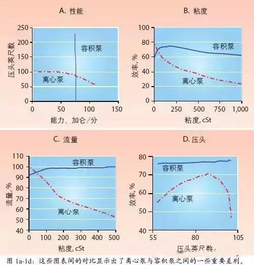 另一項(xiàng)主要差別在于粘度對(duì)泵容量的影響。在流量表(圖1c)中您會(huì)注意到,離心泵會(huì)在粘度上升時(shí)出現(xiàn)流量下降的現(xiàn)象,而容積泵實(shí)際上會(huì)隨之而產(chǎn)生流量的增加。這是由于較高粘度的液體填充了容積泵內(nèi)的空隙,從而導(dǎo)致較高的容積效率。圖1c只表示了粘度對(duì)泵流量的影響。請(qǐng)牢記,系統(tǒng)內(nèi)還會(huì)出現(xiàn)管道損失量加大的現(xiàn)象。這意味著離心泵內(nèi)的流量將隨著泵差壓的增加而進(jìn)一步下降。