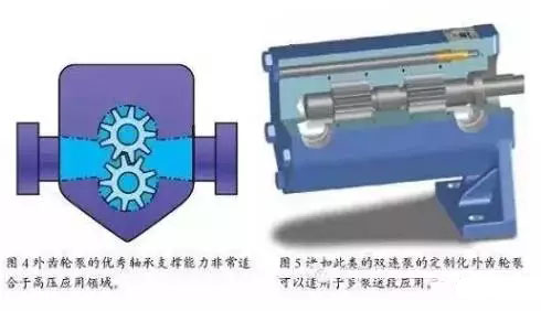 外齒輪泵在泵送動(dòng)作上與內(nèi)齒輪泵有著相似之處,也是通過(guò)兩個(gè)齒輪的進(jìn)入和脫離嚙合來(lái)帶動(dòng)液體流動(dòng)的(圖4)。但是,外齒輪泵采用了兩個(gè)相互嚙合轉(zhuǎn)動(dòng)的完全一致的齒輪。每個(gè)齒輪均由一根齒輪軸支撐,每個(gè)齒輪兩側(cè)均有軸承。在典型情況下,這四個(gè)軸承均工作于所泵送的液體內(nèi)。