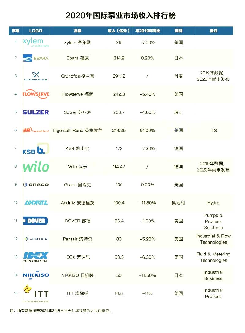 2020年國際泵業(yè)市場,相比較國內市場,由于顯而易見的疫情控制因素,不如國內恢復的快。因此,企業(yè)收入情況整體呈現(xiàn)下滑。當然隨著疫情得到有效控制,2021年值得期待。