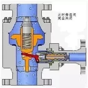 當(dāng)主閥瓣打開時(shí),閥瓣帶動(dòng)杠桿動(dòng)作,杠桿力使旁路關(guān)閉。當(dāng)主通道的流量減小,打不開主閥瓣時(shí),主閥瓣會(huì)回到密封位置,使主通道關(guān)閉,閥瓣再一次帶動(dòng)杠桿動(dòng)作,旁路打開,水從旁路流向除氧器,在壓力的作用下,水流到泵的進(jìn)口,進(jìn)行再循環(huán)動(dòng)作,從而起到保護(hù)泵的作用,見下圖。