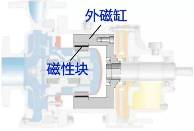 其中,由內(nèi)磁缸,外磁缸,隔離罩,磁性體組成用于泵驅(qū)動(dòng)的磁力耦合器,也叫永磁聯(lián)軸器、磁力聯(lián)軸器。
