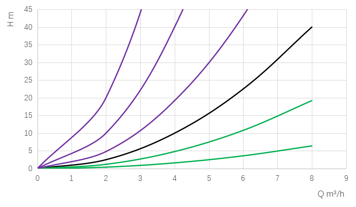對(duì)于改變的系統(tǒng)阻力曲線,當(dāng)閥門逐漸關(guān)閉時(shí),曲線變陡(紫色線條),當(dāng)閥門逐漸打開時(shí),曲線變平緩(綠色線條)。