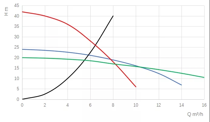 綠色曲線更加平緩,交點(diǎn)是5.4m3/h,18m,紅色曲線更加陡峭,交點(diǎn)是6.5m3/h,26m,由此可見,功率提升后,流量是否能得到提升需要結(jié)合水泵性能與系統(tǒng)阻力一起評(píng)估,簡單的靠功率提高來選取水泵,未必能提供更大的流量。