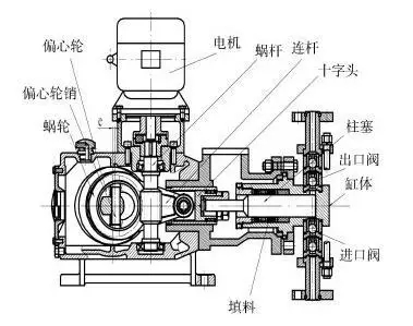 電動隔膜泵上的電機通過減速箱帶動左右兩端柱塞上面的隔膜一前一后往復(fù)運動。在左右兩個泵腔內(nèi),裝有上下四個單向球閥隔膜的運動,造成工作腔內(nèi)的容積的改變,迫使四個單向球閥交替地開啟和關(guān)閉,從而將液體不斷地吸入和排出。