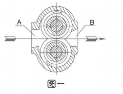 本型泵在泵體中裝有一對(duì)回轉(zhuǎn)齒輪,一個(gè)主動(dòng),一個(gè)被動(dòng),依靠?jī)升X輪的相互嚙合,把泵內(nèi)的整個(gè)工作腔分兩個(gè)獨(dú)立的部分。(圖一)A為吸入腔,B為排出腔。泵運(yùn)轉(zhuǎn)時(shí)主動(dòng)齒輪帶動(dòng)被動(dòng)齒輪旋轉(zhuǎn),當(dāng)齒轉(zhuǎn)從嚙合到脫開時(shí)在吸入側(cè)(A就形成局部真空,液體被吸入。被吸入的液體充滿齒輪的各個(gè)齒谷而帶到排出側(cè)(B,齒輪進(jìn)入嚙合時(shí)液體被擠出,形成高壓液體并經(jīng)泵的排出口排出泵外。